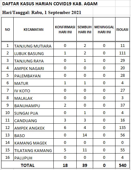 “Dengan tambahan 18 kasus positif baru itu, total kasus Covid-19 di Agam hingga kini berjumlah 7.559 orang,” kata Kepala Dinas Kesehatan Agam, dr. Hendri Rusdian.