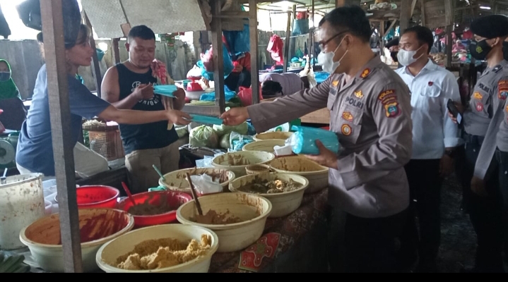 Tim gabungan dalam kesempatan tersebut kemudian membagikan masker sebanyak 1.100 pcs (seribu seratus) kepada masyarakat yang tidak menggunakan masker