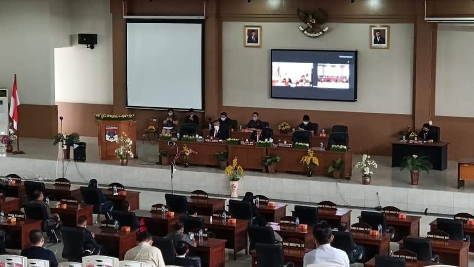 Rapat Paripurna yang dilaksanakan secara langsung dan melalui video conference, diikuti oleh Bupati DR Christiany Eugenia Paruntu, SE dan Wakil Bupati Franky Donny Wongkar, SH.