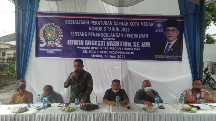 Medan,infoindependen.com – Anggota komisi IV Dewan Perwakilan Rakyat Daerah (DPRD) Kota Medan dari Fraksi PAN Edwin Sugesti Nasution, SE. MM melaksanaan sosialisasi Peraturan Daerah Kota Medan (Sosper) Nomor 5 Tahun 2015 tentang penggulangan kemiskinan di Jl. Pendidikan/Sehati Kel. Tegal Rejo, Kec. Medan Perjuangan Kota Medan, Sabtu (26/06/21).