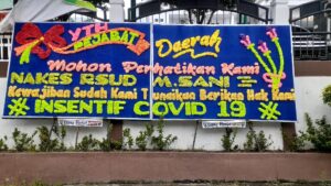 Sementara itu dari pantauan awak media di lapangan, terlihat ada dua papan bunga cukup besar di depan kantor Kejaksaan Negeri Karimun yang bertuliskan ”YTH Pejabat Daerah Kab. Karimun tolong berikan hak kami sbg GARDA TERDEPAN Melawan Pandemi COVID-19 #INSENTIF-NAKES#.