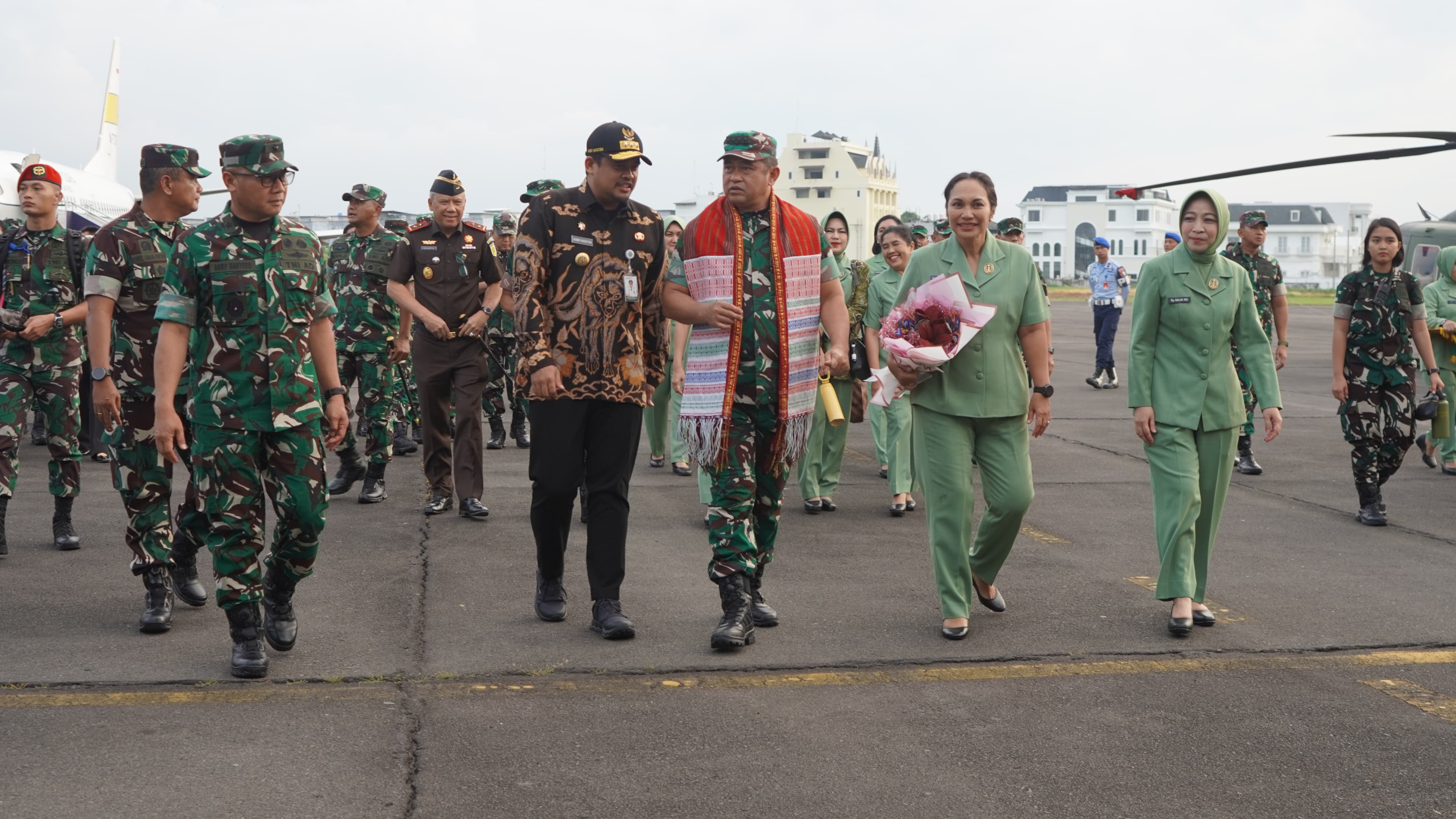 Setibanya di Lanud Soewondo, Jenderal Maruli dan Ny. Uli Simanjuntak disambut secara adat dan resmi sebagai wujud penghormatan terhadap pimpinan tertinggi TNI AD.