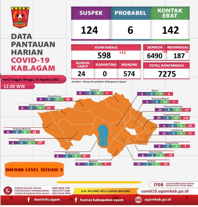 Lubuk Basung,infoindependen con – Persentase kesembuhan Covid-19 di Kabupaten Agam mencapai 89,20 persen pada Minggu (22/8) dengan total 6.490 orang. Jumlah tersebut bertambah 92 orang dibandingkan hari sebelumnya.
