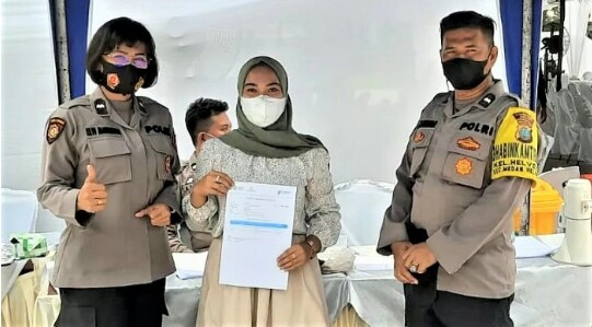 “penerima Vaksin nantinya akan dilakukan pengecekan suhu dan pemeriksaan tensi dan dilakukan skrining oleh dokter yang telah ditunjuk, jika sudah dinyatakan siap dan setuju, maka langsung dilakukan penyuntikan Vaksin kepada penerima oleh petugas medis, dan bagi masyarakat yang sudah melaksanakan Vaksin dapat beristirahat di tempat yang sudah kami sediakan selama 30 menit sebelum melanjutkan aktivitasnya, dan kami juga ada menyiapkan makanan serta minuman ringan yang akan kami berikan kepada masyarakat, apabila sudah melaksanakan pendaftaran Vaksinasi,” pungkas Kompol Pardamean Hutahean, SH., S.I.K