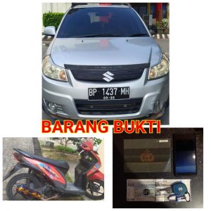 Barang bukti yang berhasil di amankan, yakni 1 unit mobil Suzuki X-Over BP 1437 MH beserta kunci mobil (milik korban), 1 unit sepeda motor Beat warna merah (sebagai sarana), 1 BPKB mobil Suzuki X-Over BP 1437 MH, 1 STNK mobil Suzuki X-over BP 1437 MH, 1 buah sweater , 1 unit handphone Vivo (milik korban).