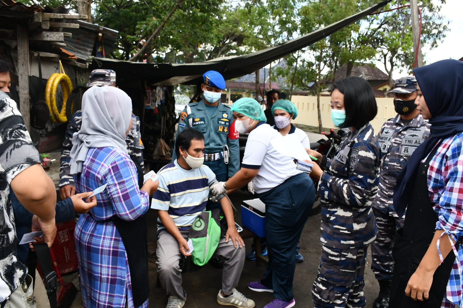 Untuk mendukung pelaksanaan kegiatan vaksinasi disiapkan tenaga kesehatan sebagai vaksinator sebanyak 1 Tim dari RSAL Komangmakes yang berhasil memberi vaksin sekitar 50 pedagang makanan, tukang bengkel dan tukang ojek sekitar Belawan, TNI AL Lantamal I akan terus melaksanakan serbuan vaksinasi maritim baik secara serbuan massal, vaksiansi reguler secara rutin di RSAL Komang Makes dan Diskes Lantamal I maupun secara _door to door_ kepada masyarakat Belawan dan sekitarnya. (Dispen Lantamal I / Syamsul B)